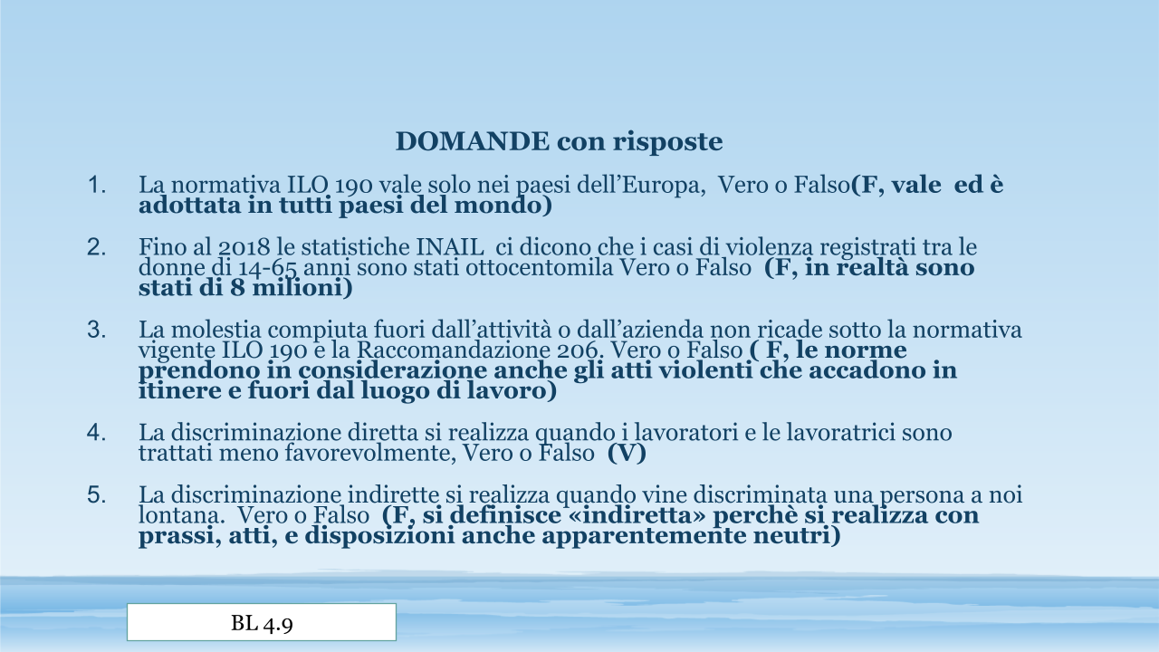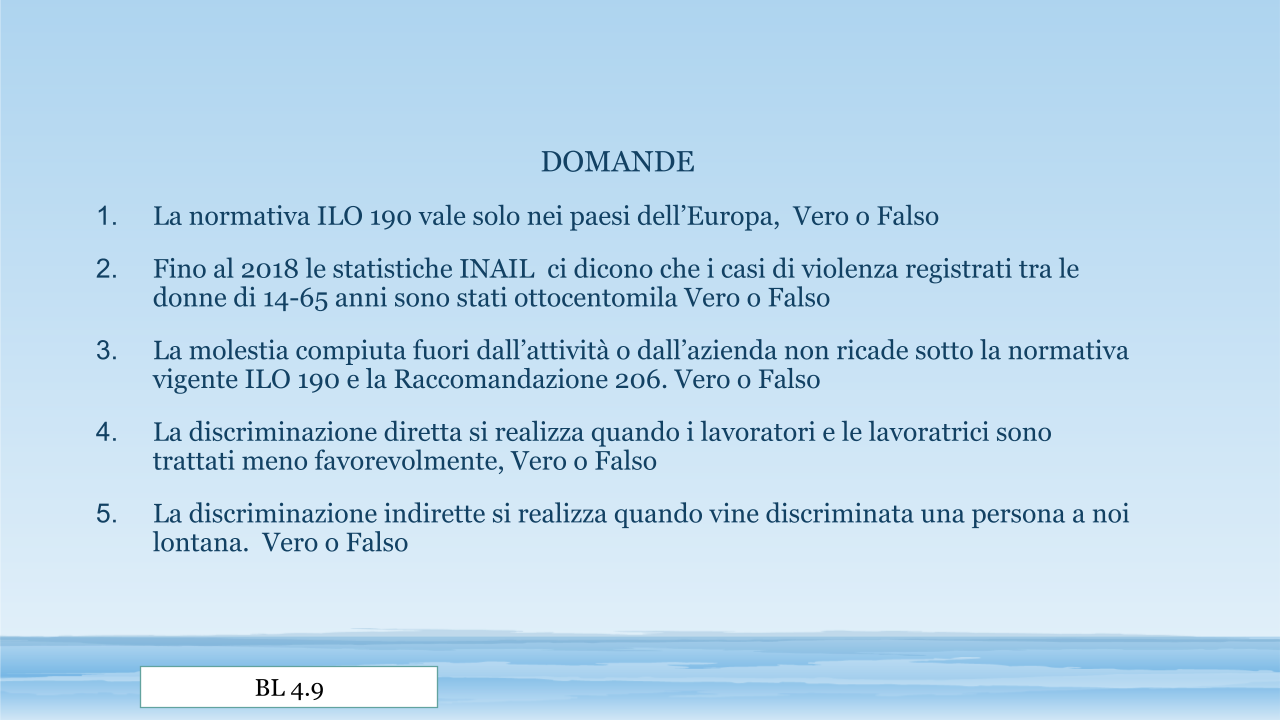 Misure per il benessere lavorativo ed organizzativo. La direttiva ILO 190 e la Raccomandazione 206. Codici Etici Aziendali. Legge 168 e Codice Rosso. Il ruolo del Comitato Unico di Garanzia (CUG) nelle pubbliche amministrazioni. La Consigliera di Fiducia. Il numero di emergenza 1522. I Segnali deboli. Violenza Sessuale ed aggravanti. Violenza in Itinere. Discriminazioni Dirette e Discriminazioni Indirette. Molestie e Molestie Sessuali. Convenzione di Istambul del 11 maggio 2011. Linee Guida della Direttiva ILO 190 e della Raccomandazione 206. Valutazione dei Rischi secondo la 624/1994 e il Testo Unico 81 /2008. Domande (5)