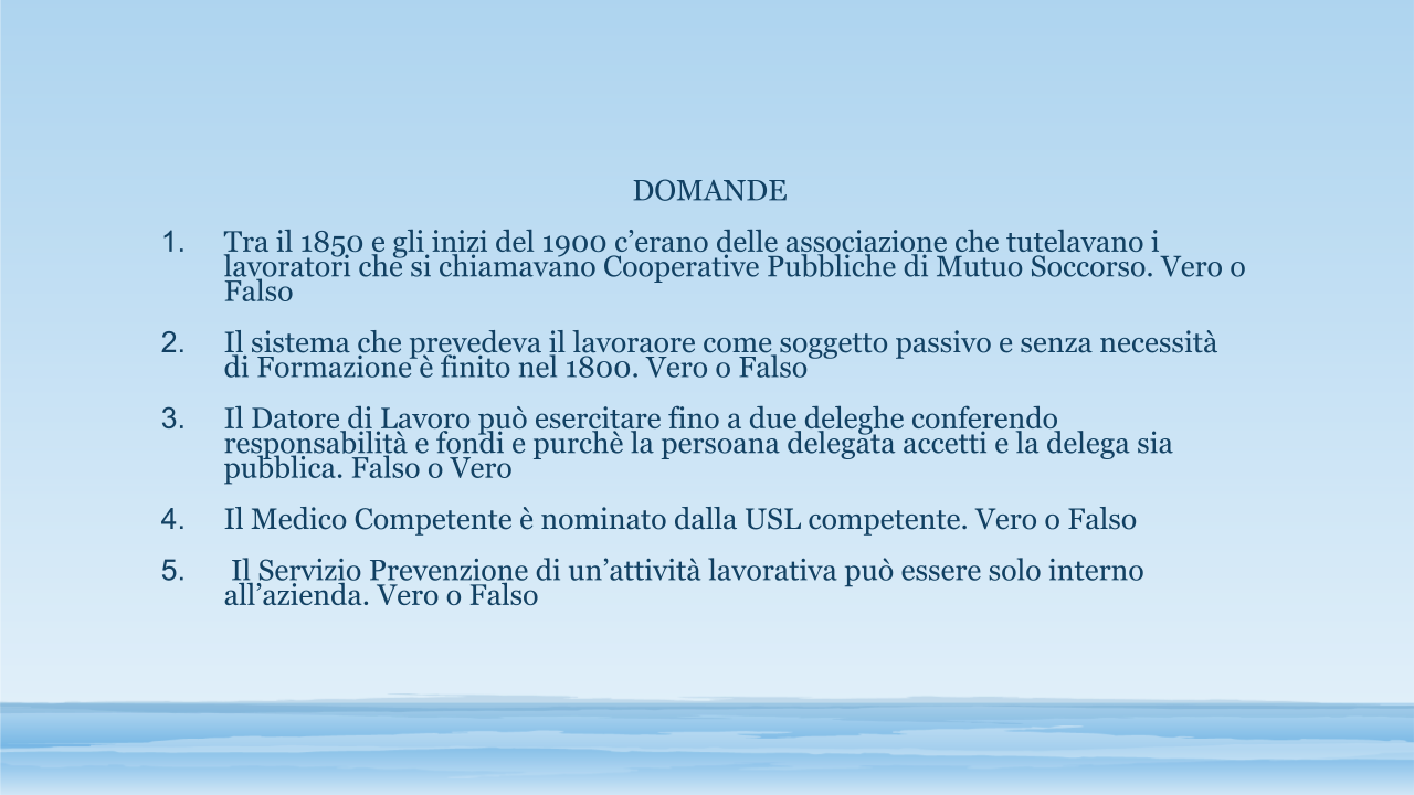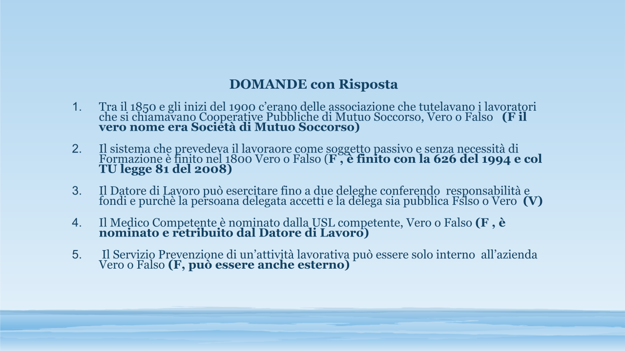 Cenni storici su Salute e Sicurezza. Autoorganizzazione dei lavoratori per tutelarsi. Il concetto del Buon Padre di Famiglia per la tutela dei lavoratori. Le conquiste dei diritti dei lavoratori e delle lavoratrici. Arrivo della legge 626 del 1994 e del Testo Unico legge 81 del 2008. Le figure previste nel TU 81/2008. Valutazione di Rischio e Documento di Valutazione dei Rischi (DVR). Le misure previste nel DVR. Il Piano D’Emergenza (PE). Il ruolo dei Rappresentanti dei Lavoratori per la Sicurezza (RLS). Domande (5)